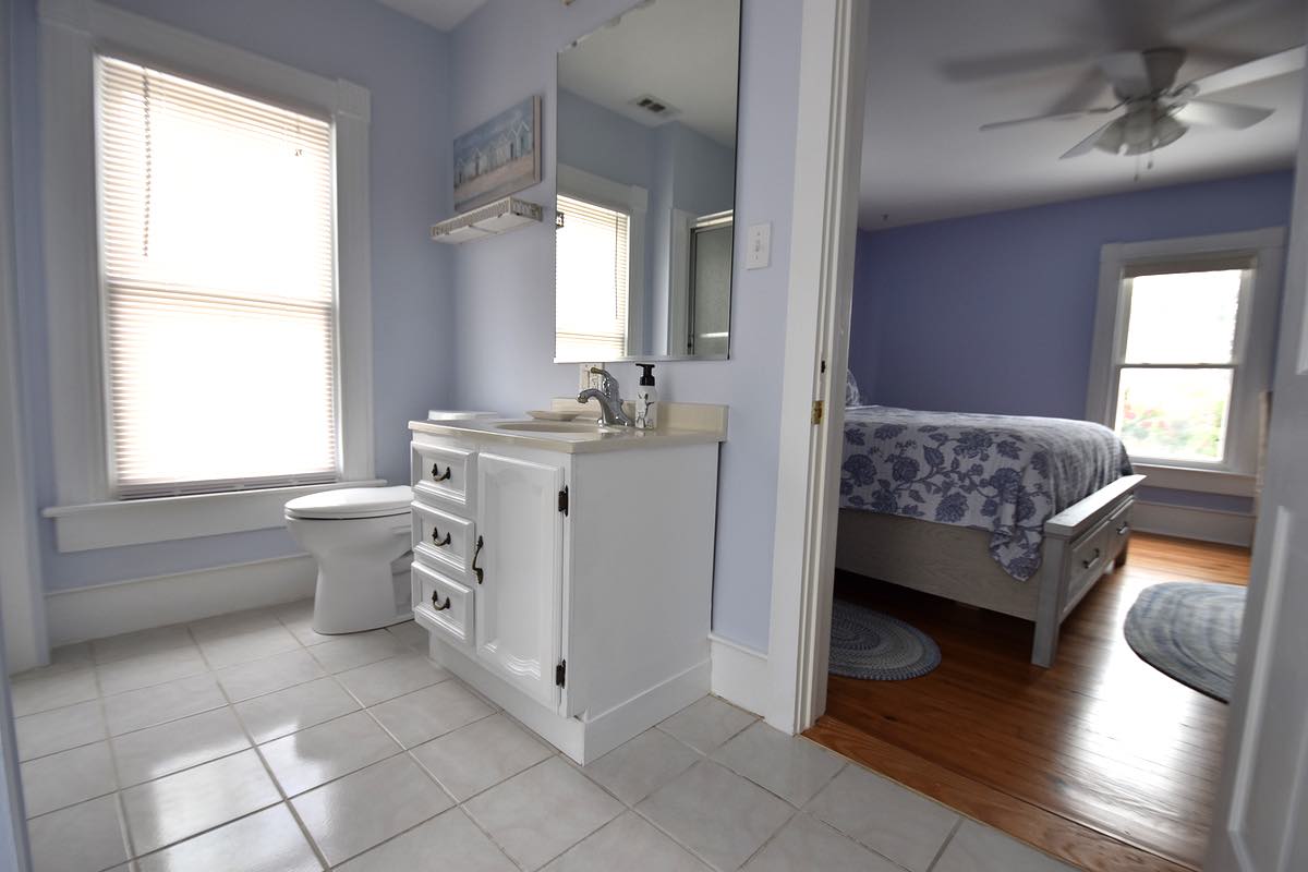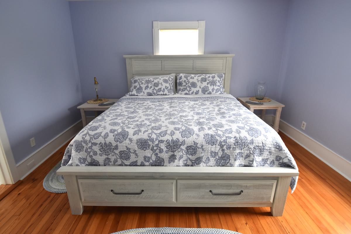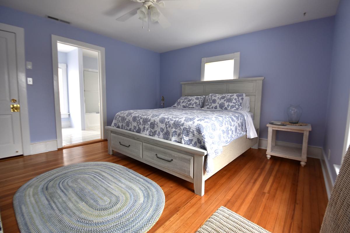 This second floor guest room evokes that cottage feeling with wicker furnishings, a king size bed, original restored heart pine floors and an abundance of sunlight. Enjoy a large, light filled bath with a tub/shower combo.