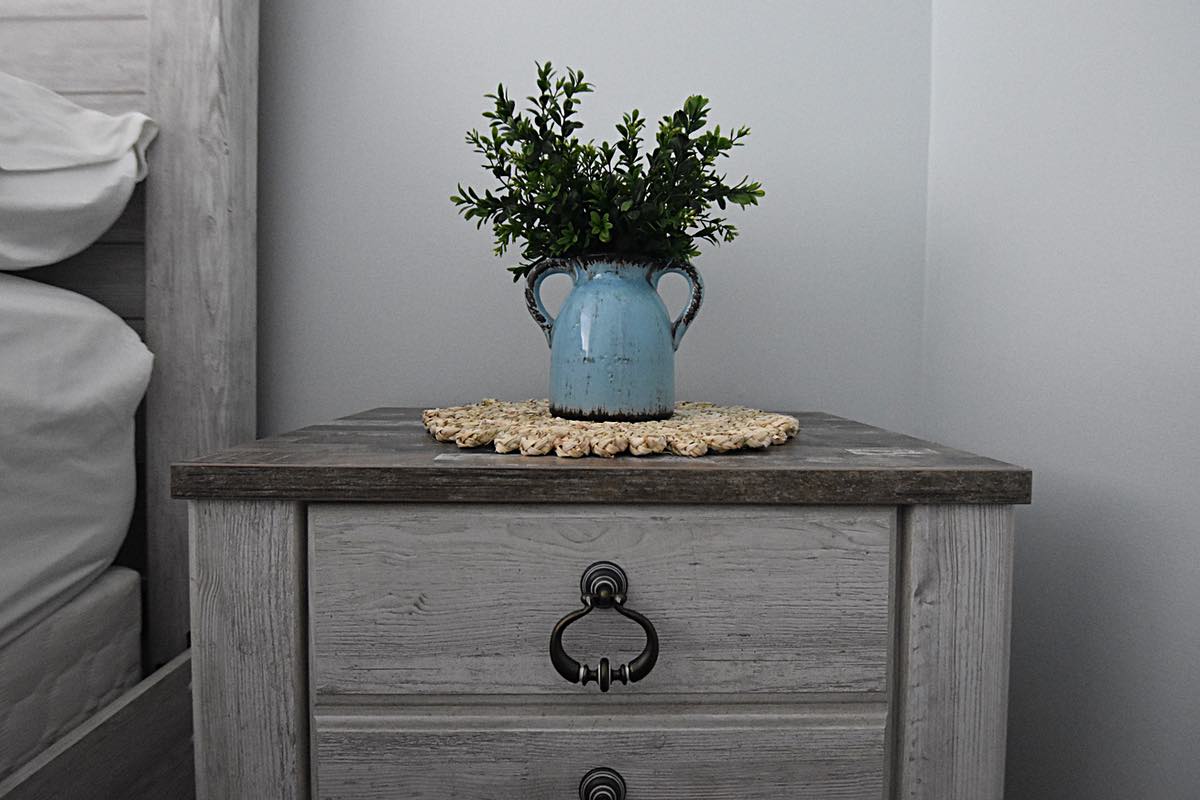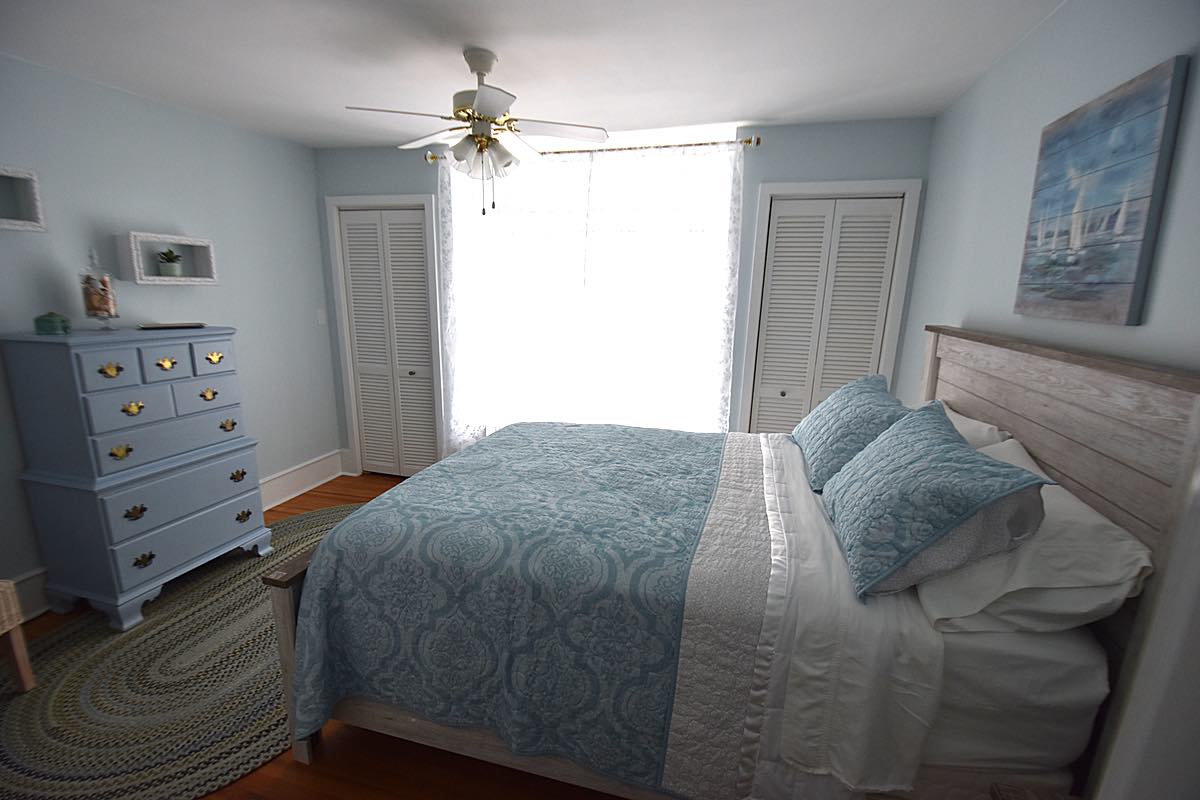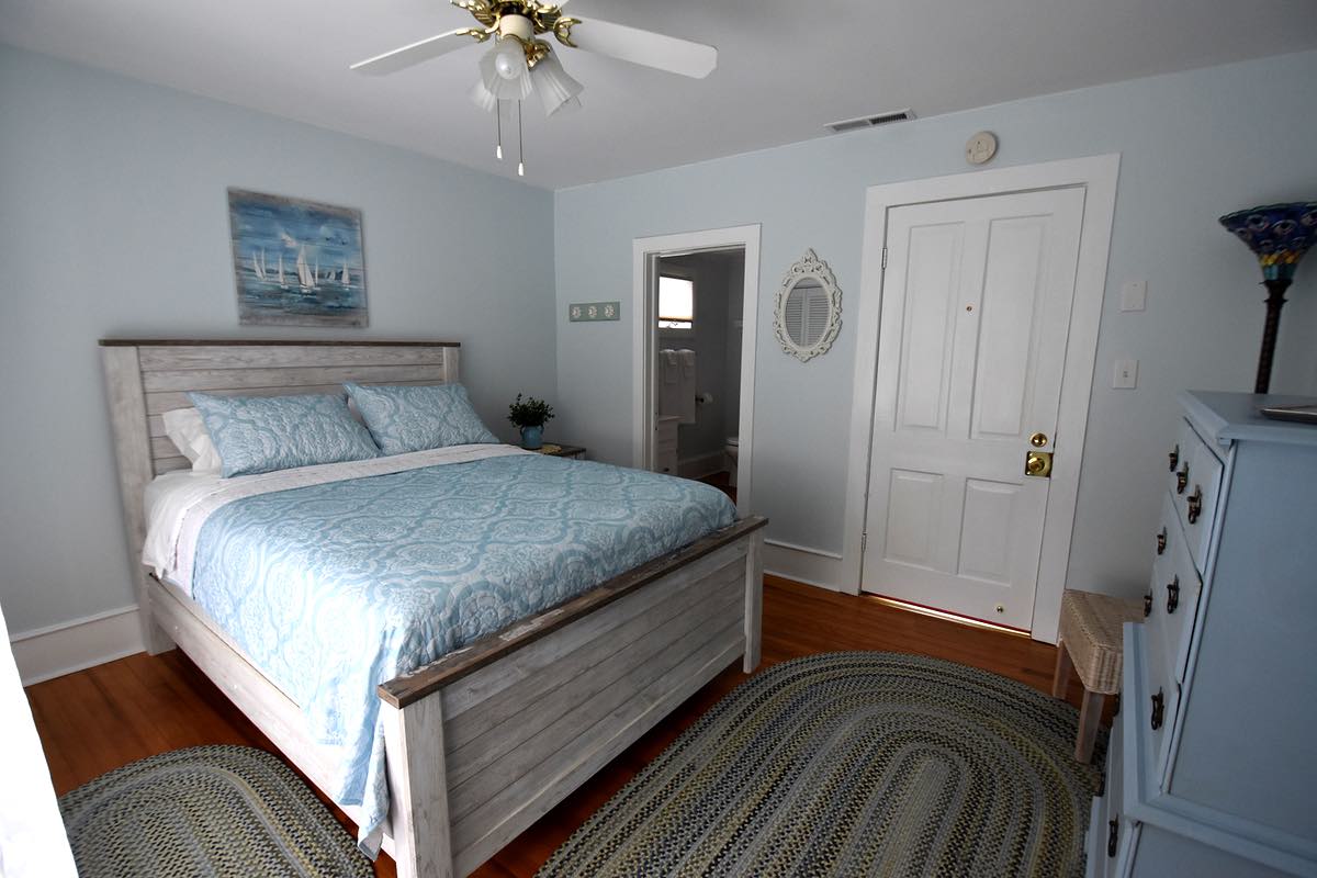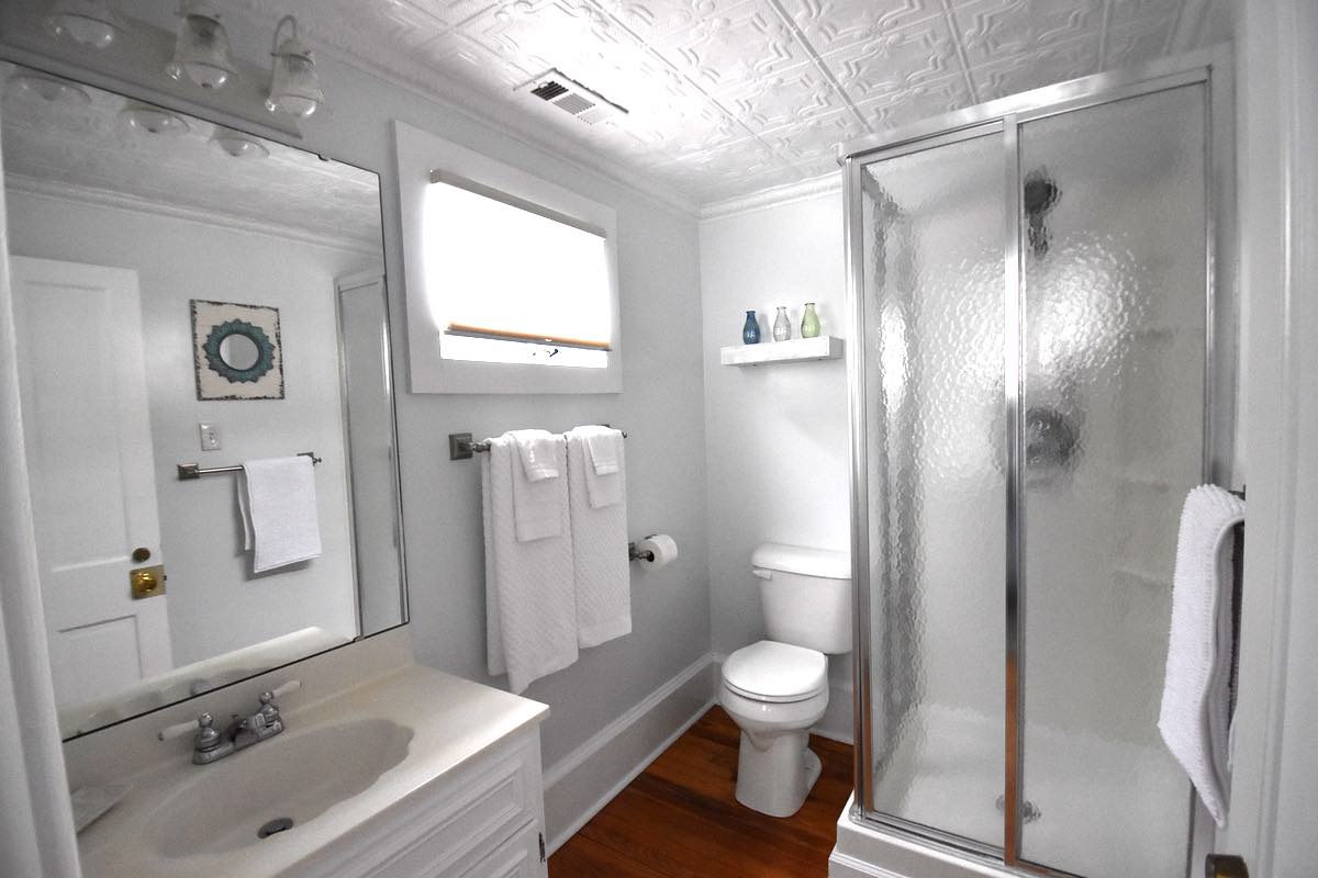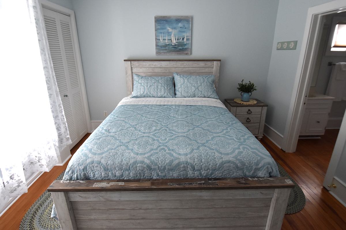 Perfect for a single guest (or happy couple), this little love nest boasts details of the homes original 1903 construction in the restored, original heart pine floors, a queen size bed, sunny window seat and original tin ceiling tiles in the private bath with step in shower. Relaxing coastal palatte. Please note that the walk in shower is small (think cruise ship) and this room is located on the second floor and requires one flight of stairs.